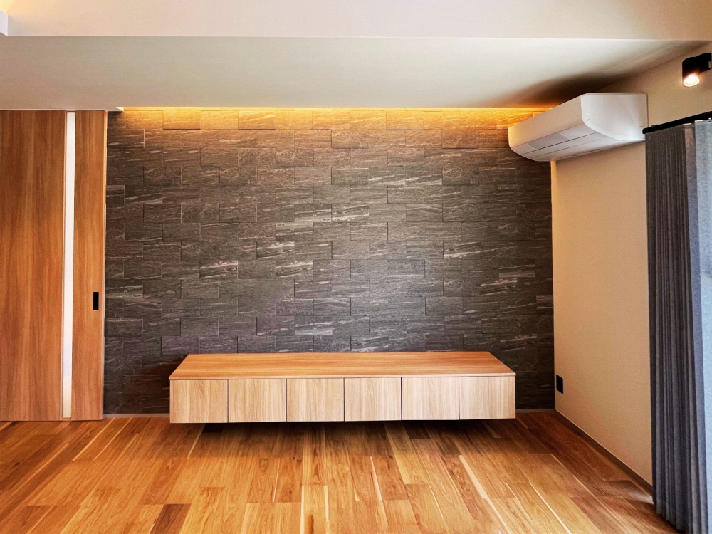 このモダンで和の雰囲気を持つ壁面は、お施主様のお父様が施工された作品です。