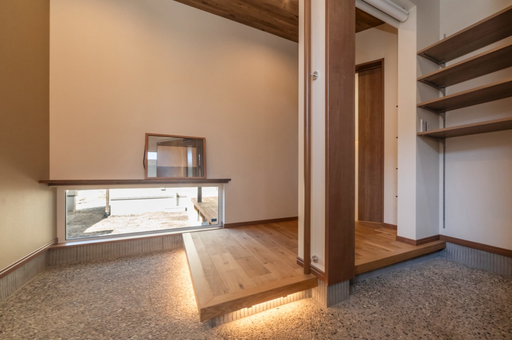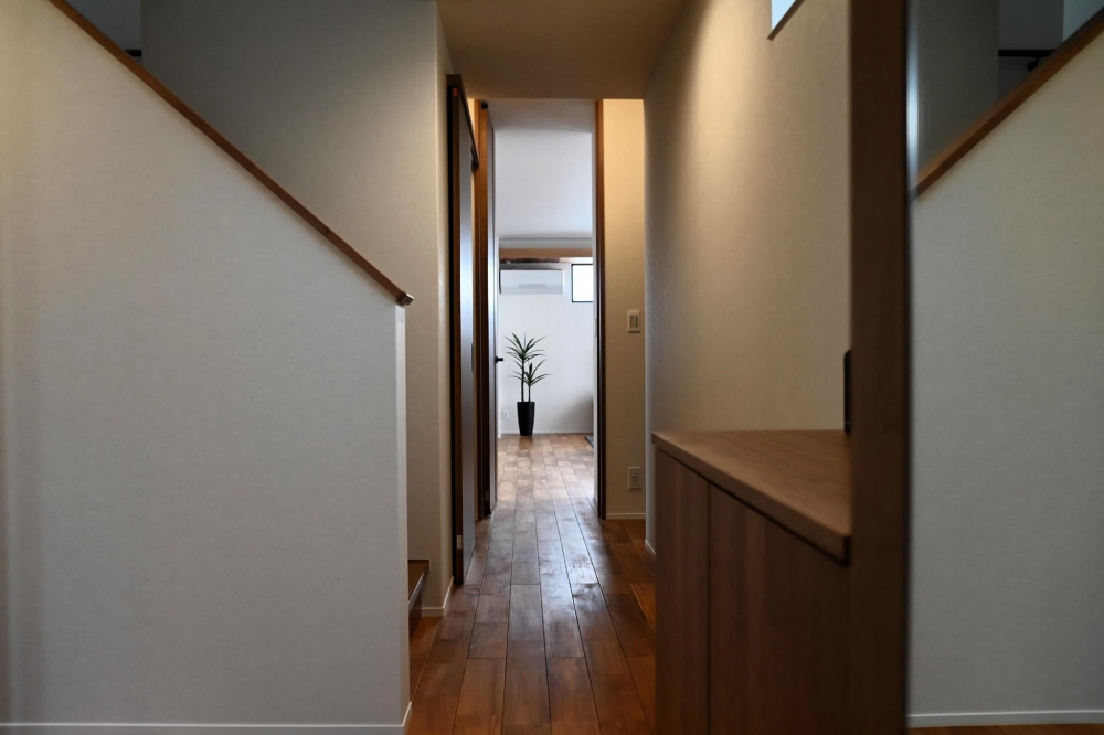 玄関からリビング・水廻りスペースへのスムーズなアクセスを確保し、家事やくつろぎの時間をより快適にしました。