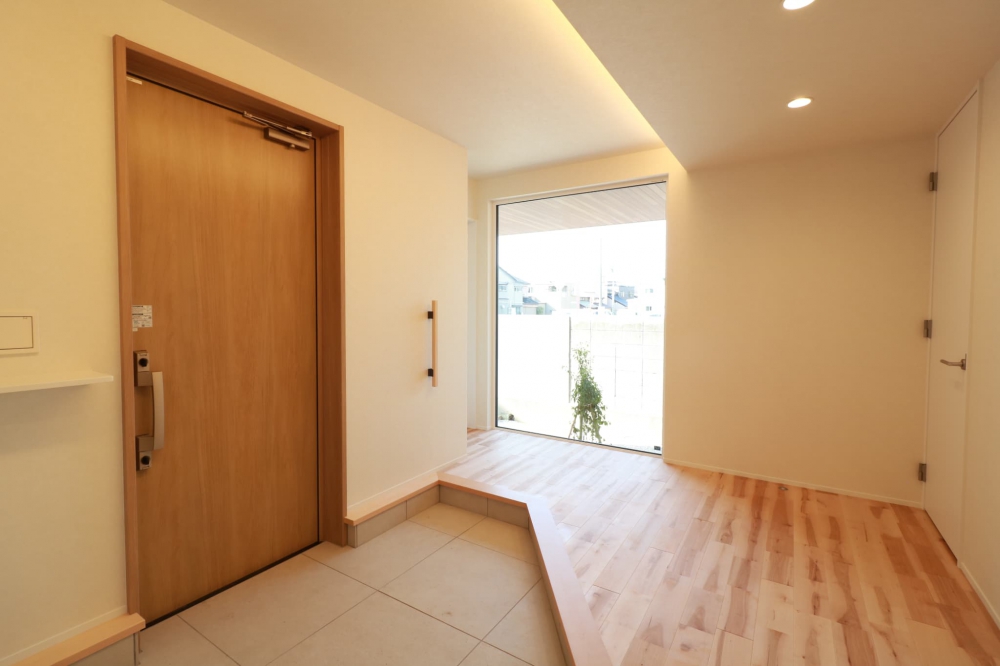 玄関からリビングと水廻りエリアへのスムーズなアクセスを提供し、効率的なデザインを実現しています。
