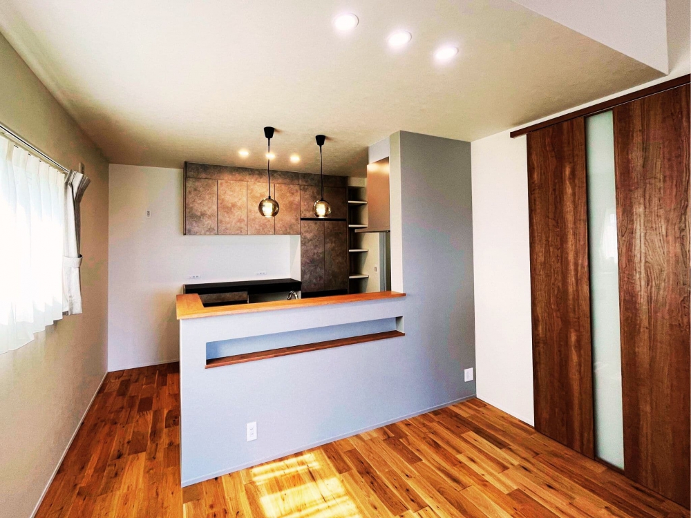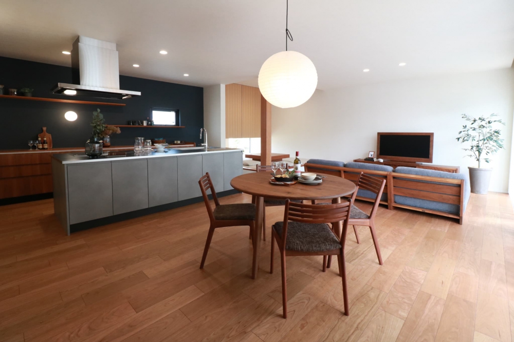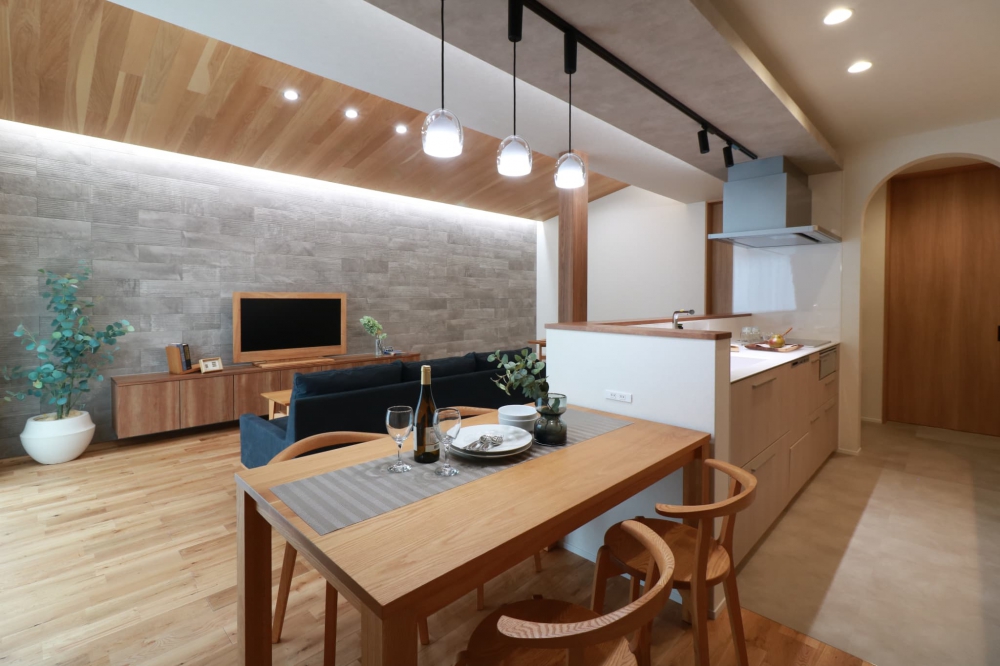 ダイニングのペンダントライトやリビングのアクセントタイルがモダンな雰囲気を演出。