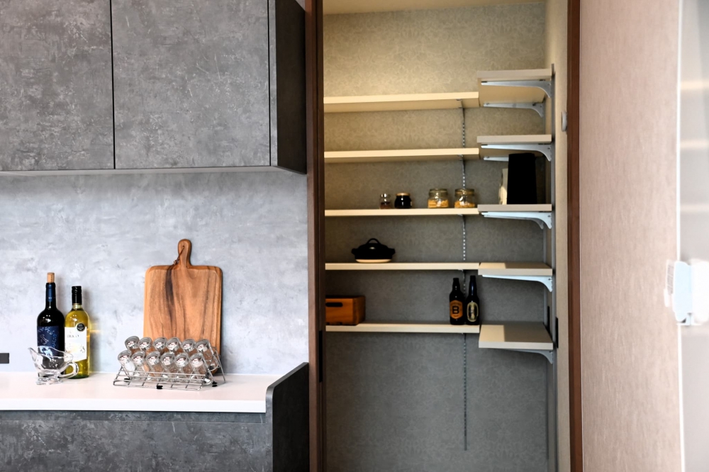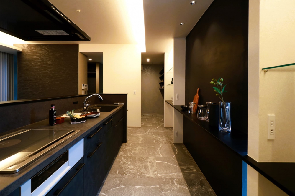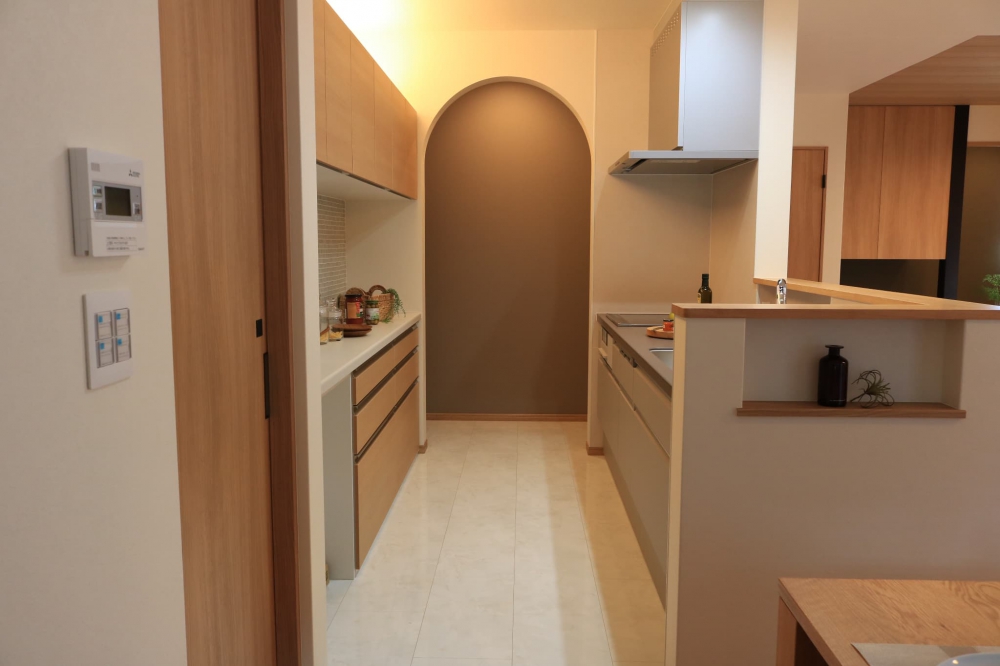 キッチンからパントリー、洗面室、ユーティリティへと流れるような水廻り動線は機能的で美しさすら感じさせます。