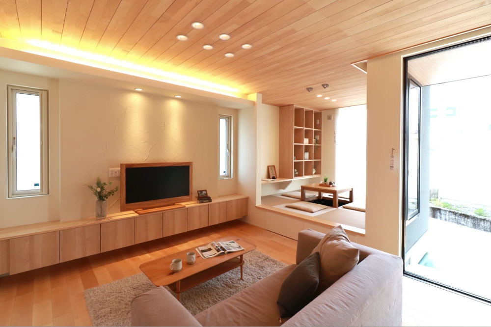 勾配天井と間接照明で開放感を演出したリビングには、視線が抜ける畳コーナーを配置。
