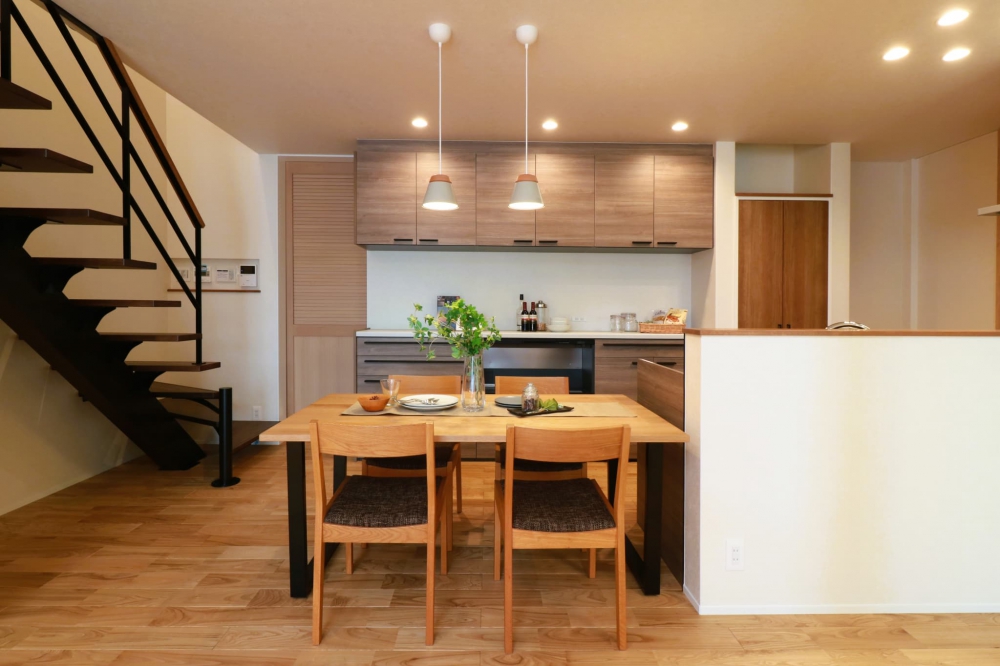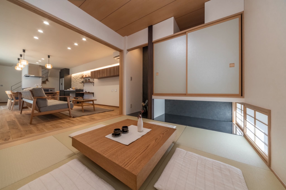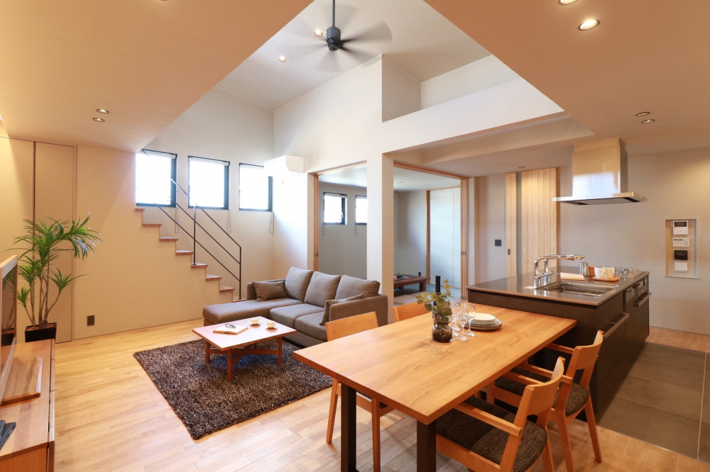 1階の広々としたLDKは和室と調和し、リラックスできる空間を演出。