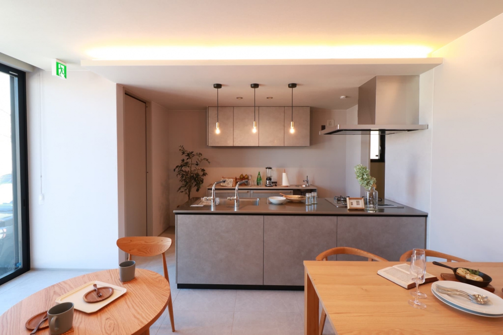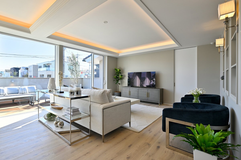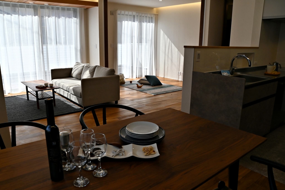 リビング・ダイニングエリアには、大きな窓が取り入れられ、外のタイルテラスとの調和があり、開放感豊かな空間を楽しめます。