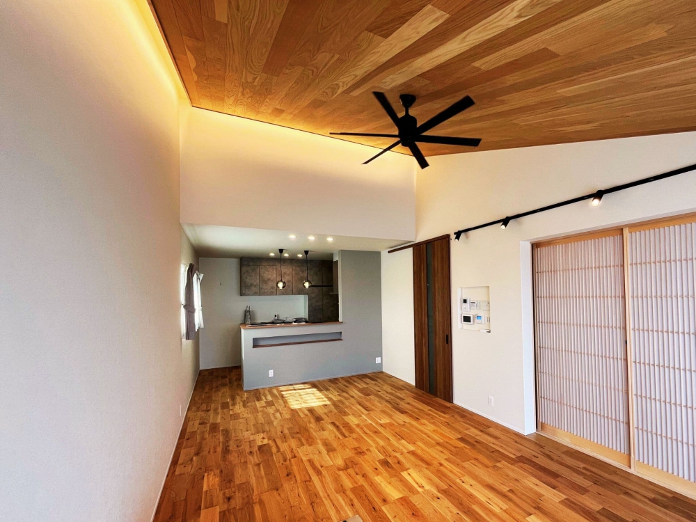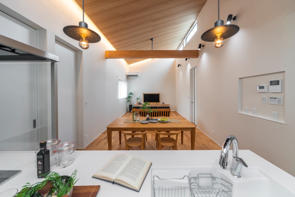勾配天井が開放感を生み出し、効率的な家事動線が家事の負担を軽減します。