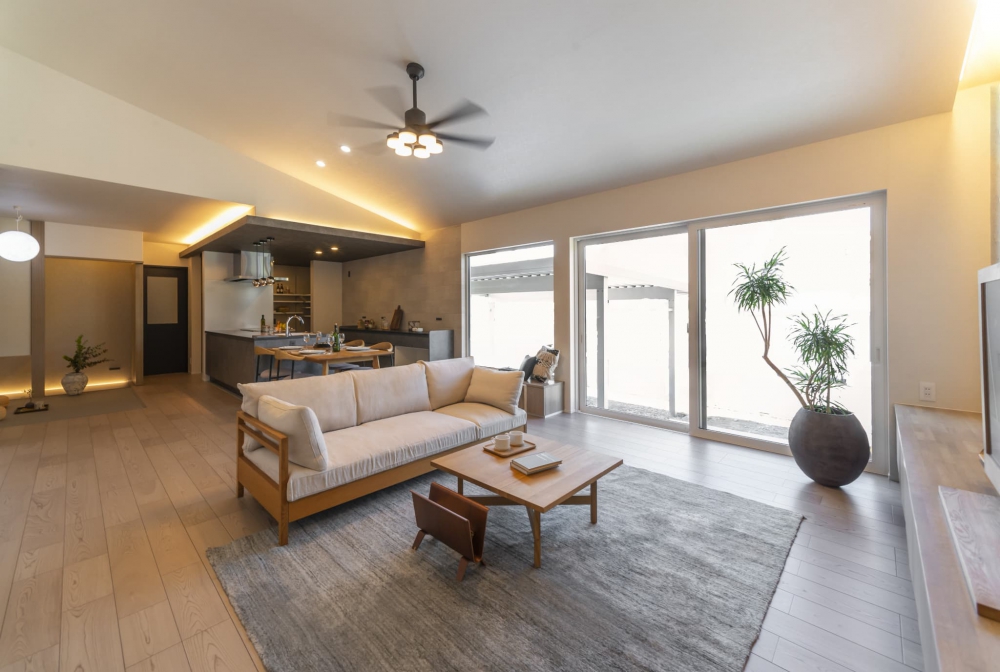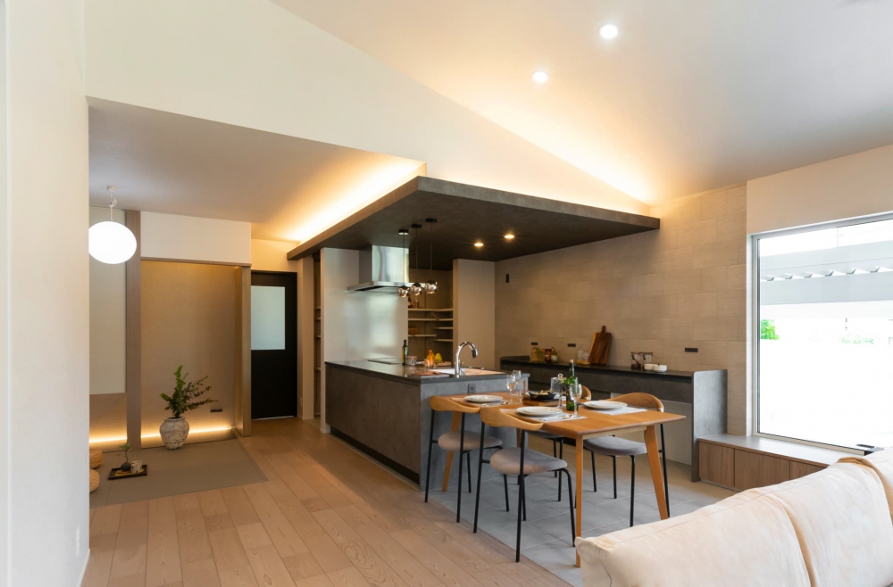 自然光と和モダンが調和する平屋は、四季を感じられるリビングや家事効率を考えた動線設計が特徴です。