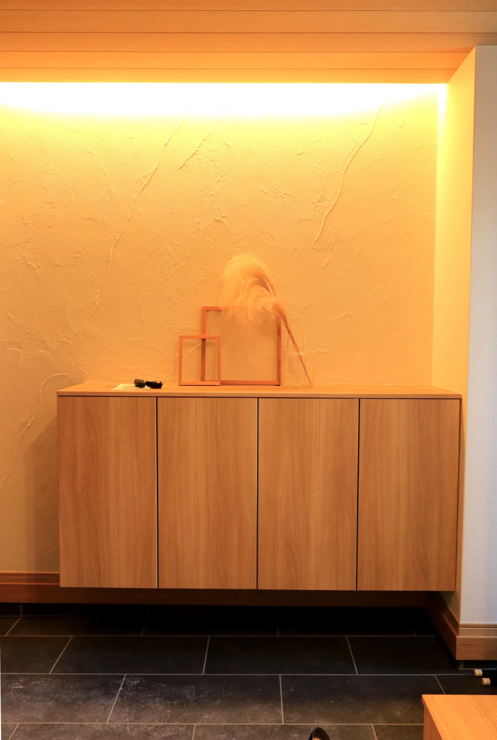 玄関ホールには間接照明や家族の思い出を飾るニッチが配され、洗練されたデザインが随所に施されています。