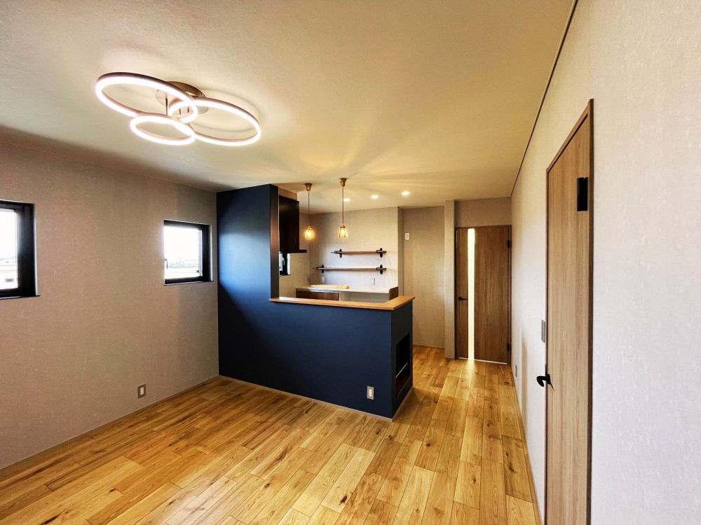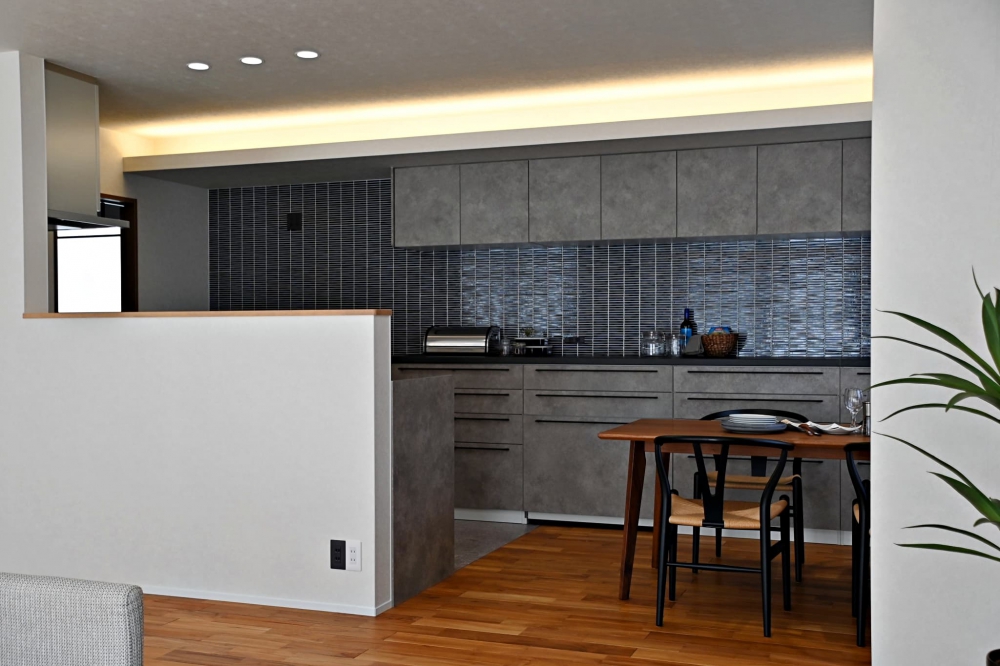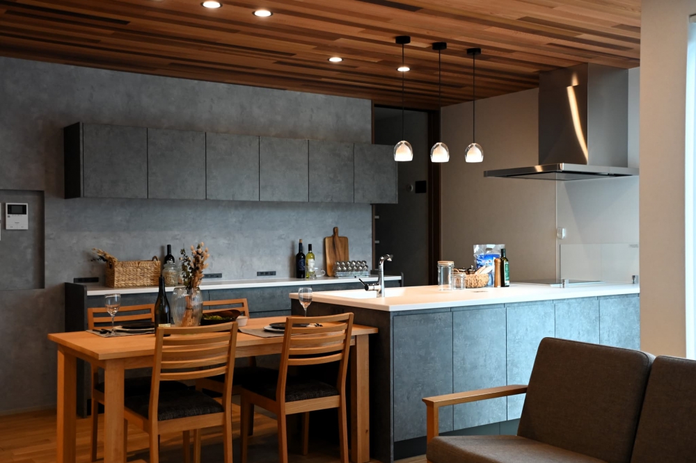 グレー基調のアイランドキッチンと深いネイビーの壁紙が、都会的で洗練された印象を強調します。