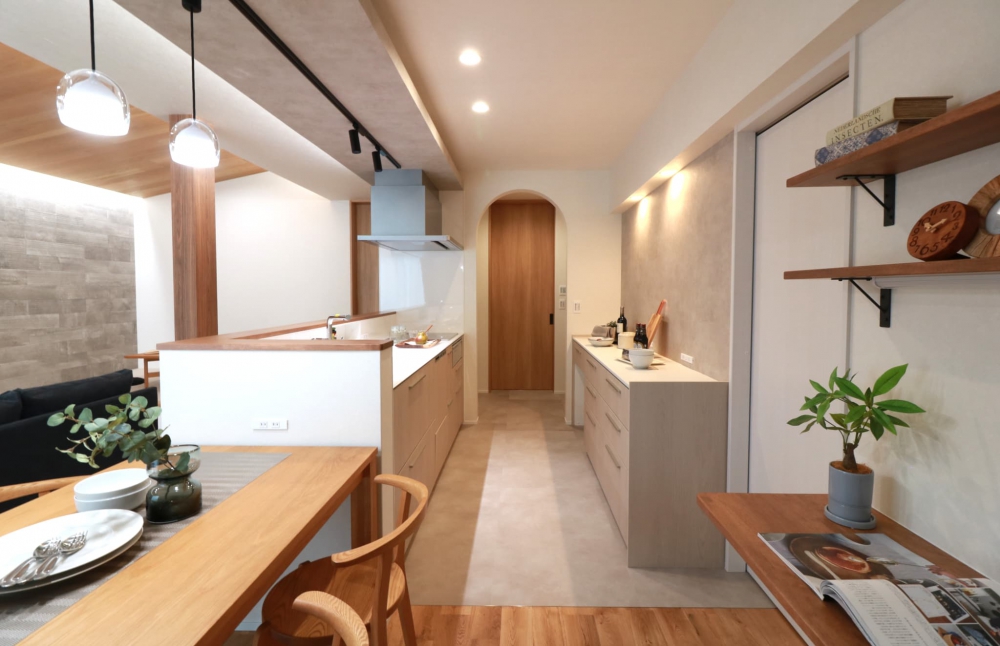 和と洋を融合したモダンスタイルで、木目の美しいナチュラル素材を基調としています。