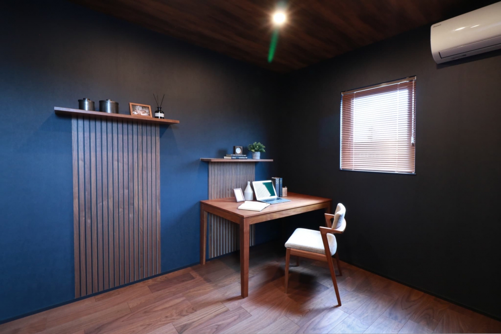 2階には広々とした寝室と二つの子供部屋があり、書斎は木の温もりとネイビーが織りなす上品で穏やかな空間です。