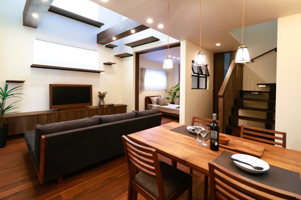 玄関の格子やリビングの小上がり畳による和のテイスト、ウォルナットの木質感と間接照明が演出するモダンな雰囲気が特徴です。