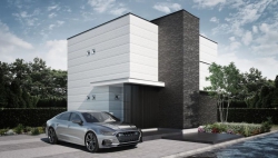シックなツートーンで、上品かつ堂々とした佇まいに。シンプルな線と面で構成されながら、一部が張り出したファサードは、おしゃれで表情豊かである。