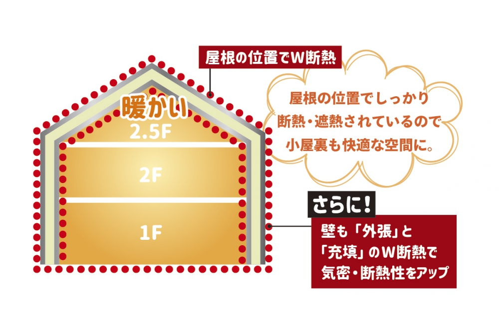 吹き抜けを囲むように部屋を配置したことで、家族のコミュニケーションがとりやすく、かつ各部屋の独立性プライバシーを守れる間取り。2つの洋室にそれぞれ、ロフト、小屋裏収納を備えるなど、各部屋に十分な収納スペースも確保した。大容量の小屋裏収納を確保。上り下りがラクにできる階段を備えることで、小屋裏がより有効に活用できる。屋根も断熱・遮熱がされているため、真夏も真冬も快適。