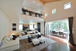 テーマは『みんなで集まれる場所』。上下階に連なる吹抜けが開放感を生み出し、 大人数の来客にも対応できる広々とした空間だ。友人や会社の仲間が泊まりに来たときも、くつろげる空間である。随所にこだわりがちりばめられ、デザイン性と快適性が両立された住宅となっている。これも自由設計ならではの魅力である。「夏も快適で、エアコンを少し付けるだけで快適に眠れます」と笑顔のTさま。