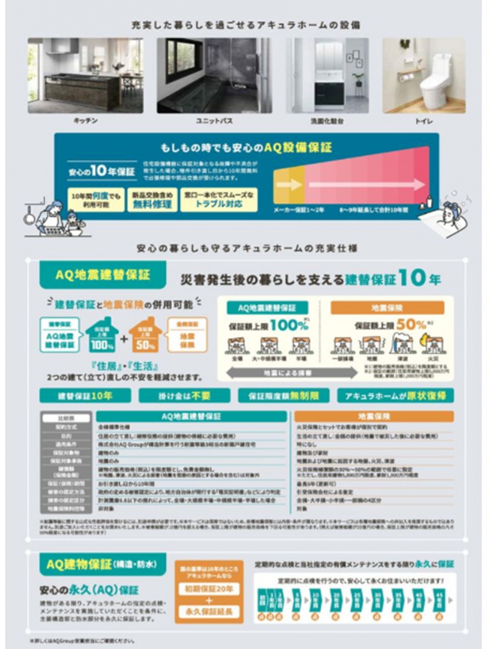 アフター保証 | お引き渡し後も安心して暮らしていただけるよう、長期保証と充実したサポート体制を整えています。専門スタッフによるご入居後1年後・2年後・5年後・10年後・20年後の無料点検をはじめ、20年目以降の点検時に発生した補修が必要な事項においてメンテナンス(有償)を受けていただくことで、主要な構造躯体を35年間長期保証。地域に密着したアキュラホームならではのサービスを実施しています。 |