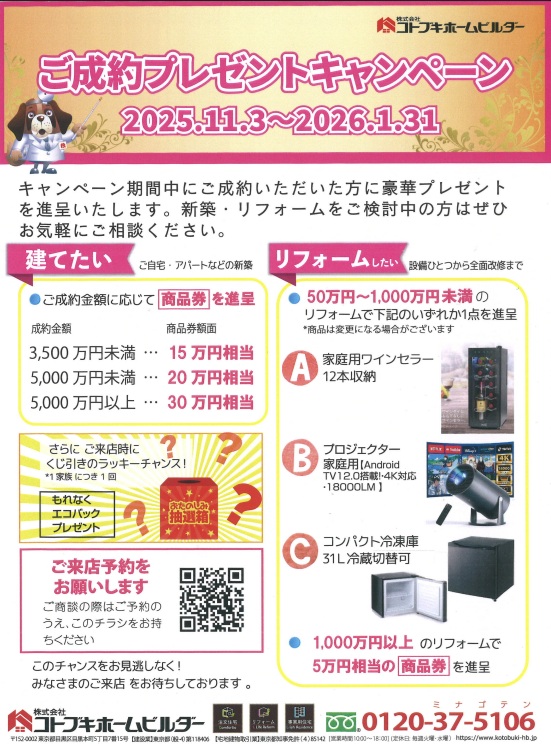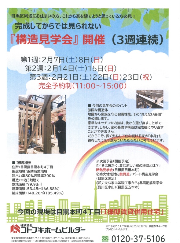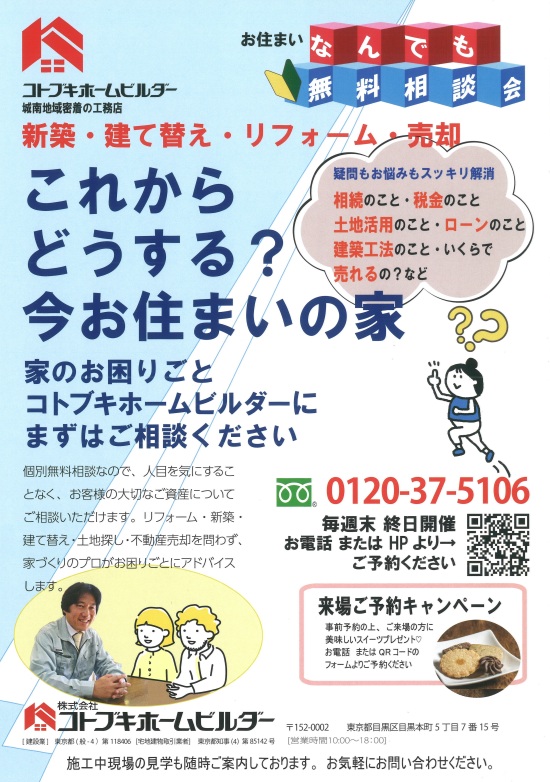 | こだわりポイント | 〇…城南で賢く暮らす - 私たちのミッション…〇 1.城南エリアを知り尽くした設計提案力 城南エリアは交通機関や商業施設が充実したとても便利なエリアです。一方で「住まい」をつくる視点でみると、敷地条件が厳しく、近隣建物の影響に配慮しなければならないなど、難しい条件をクリアする必要があります。そのためには、敷地を読み、家族の相反する要望やライフスタイルの変化まで織り込んでプランニングを行い、コストや施工方法、メンテナンスまで考慮することが大切です。それができるのは、城南エリアでの長年の経験と実績をもつコトブキホームビルダーだからこそ。「暮らす」ということに真摯に応えたプランをご提案します。 2.見えないところこそ大切にする施工・管理力 坪50万円の家もあれば100万円する家があるように、同じ大きさの家でも建て方次第でその値段に大きな差が生まれています。それは素材や設備の差だけではありません。建ててしまったらわからなくなる構造や断熱の違いが、コストに大きな差を生むのです。コトブキホームビルダーが建てる家は、冬暖かく、夏涼しく、自然災害に負けない家。それは、目にみえない部分にも手を抜かないということでもあります。構造計算やUA値計算、気密測定など事前にシミュレーションしたり、実測したりすることで、性能を「数値」として押さえ、ブレの少ない住宅性能を実現しています。 1.地域とともに生きる覚悟を持つ 住まいづくりは竣工がゴールではありません。そこで暮らすことではじめて家に命が宿るものだと、わたしたちコトブキホームビルダーは考えています。そして、経年変化や設備の老朽化に対するメンテナンスや家族の変化にあわせた増改築といった、単に家を「直す」という行為だけでなく、城南エリアのコミュニティの一員として、地域に生きる工務店として常に意識しています。 |