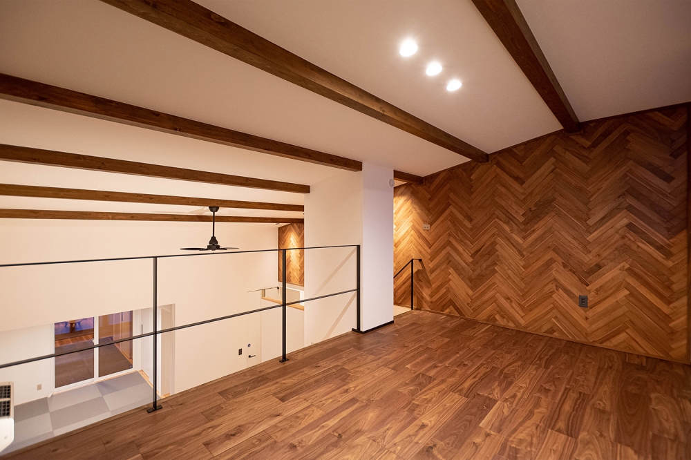 一面の壁をヘリンボーンの板張りにした個性的なデザイン。天井にはあらわし梁を採用し、より奥行きとインパクトを感じられるように工夫を凝らした