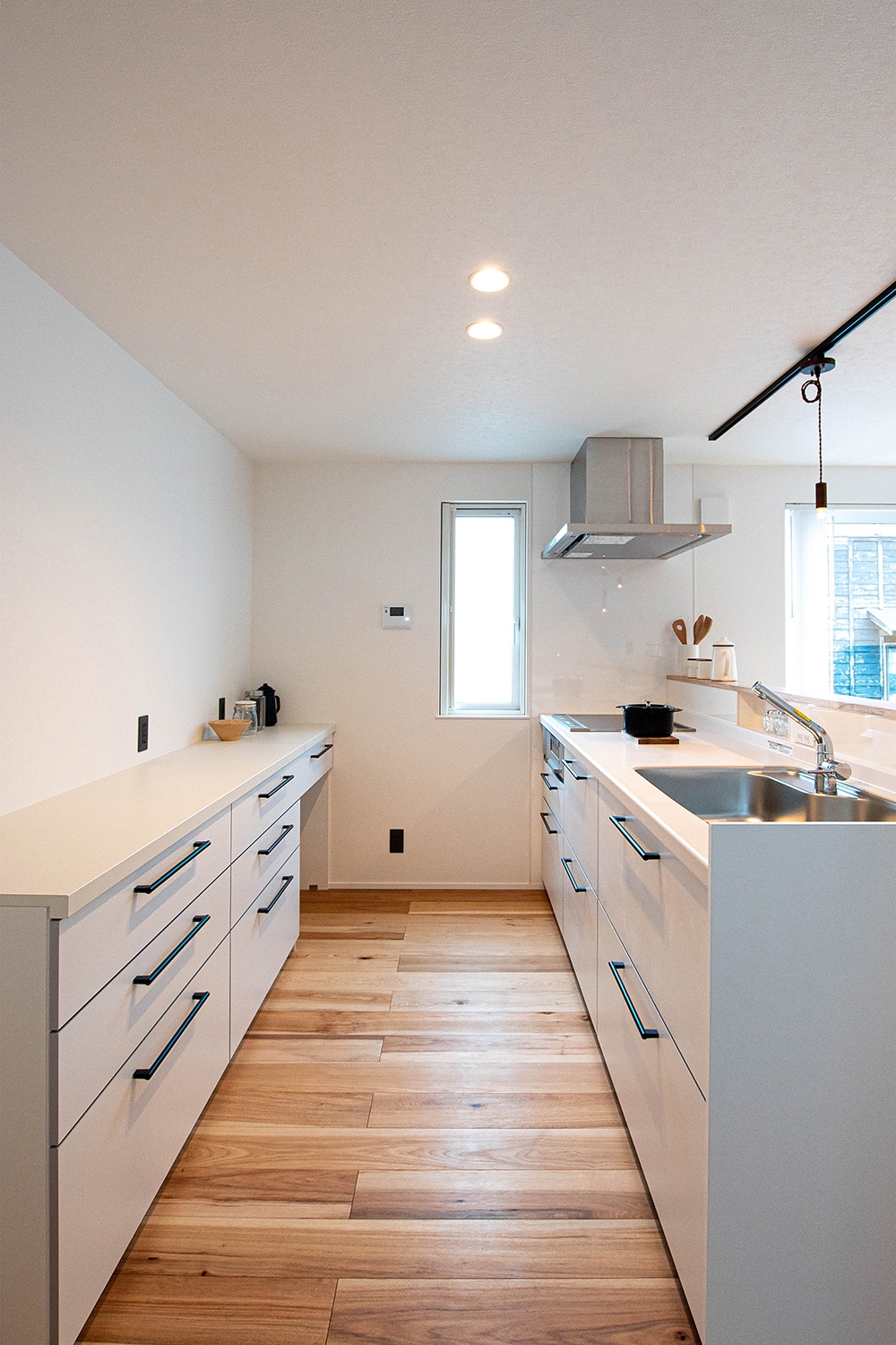 ホワイトで統一した爽やかなキッチン。背面収納とキッチン収納のデザインを揃え、全体的にシンプルな印象に仕上げた