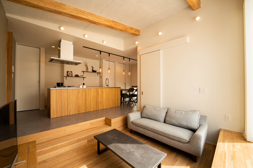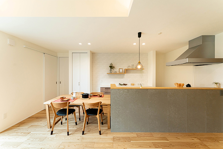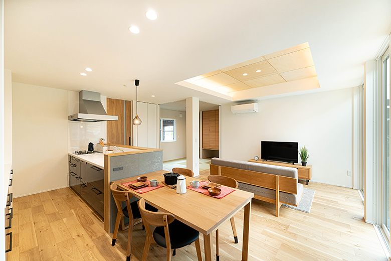無垢床や梁、キッチンカウンターに採用した無垢材が温かみを添え、家族団らんのひとときを優しく包む