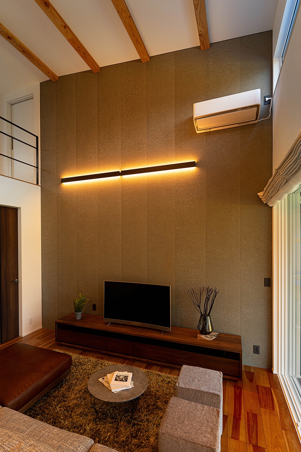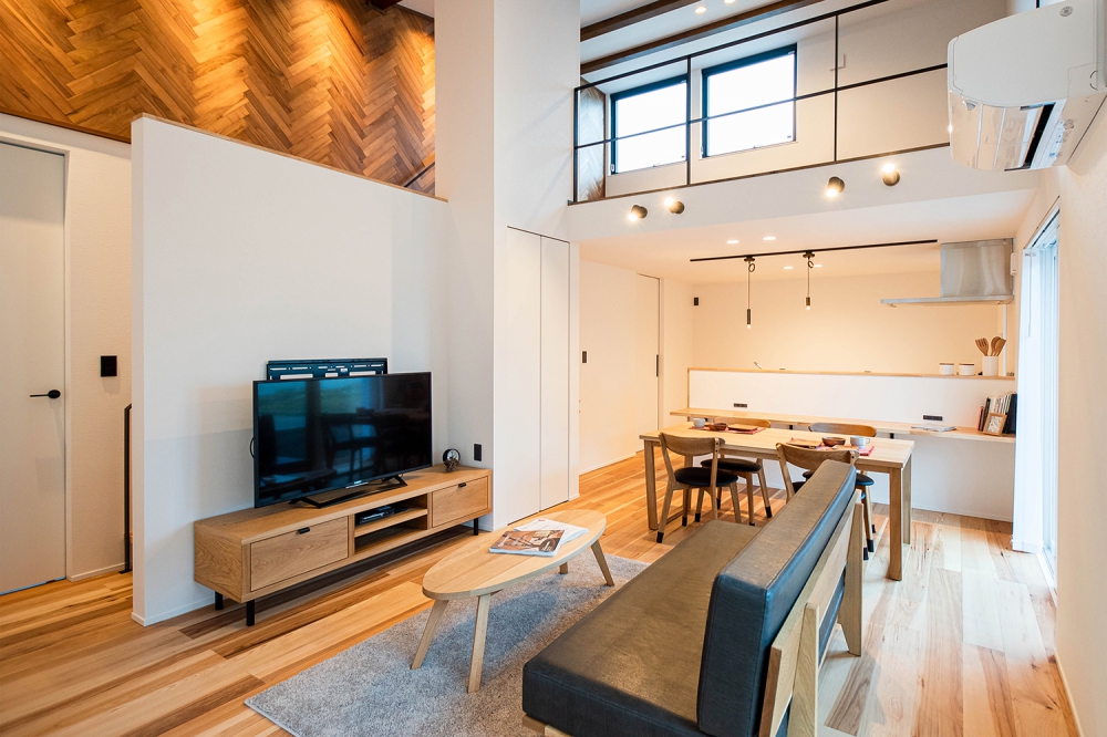 化粧梁やダウンフロアに合わせたライニング、壁一面のアクセントウォールなど、デザインにもこだわる