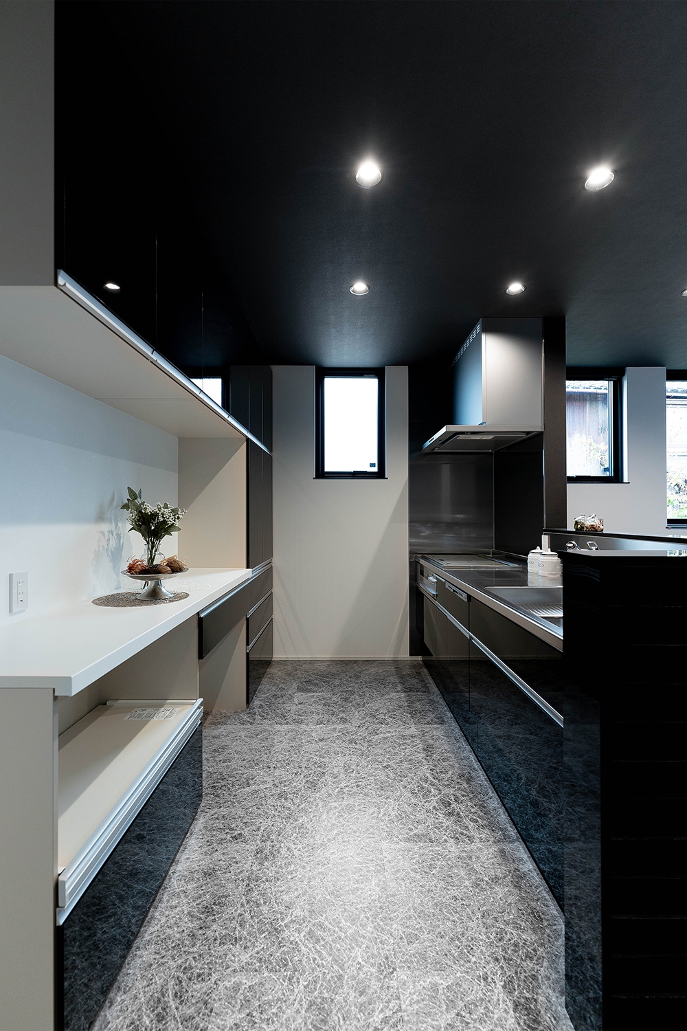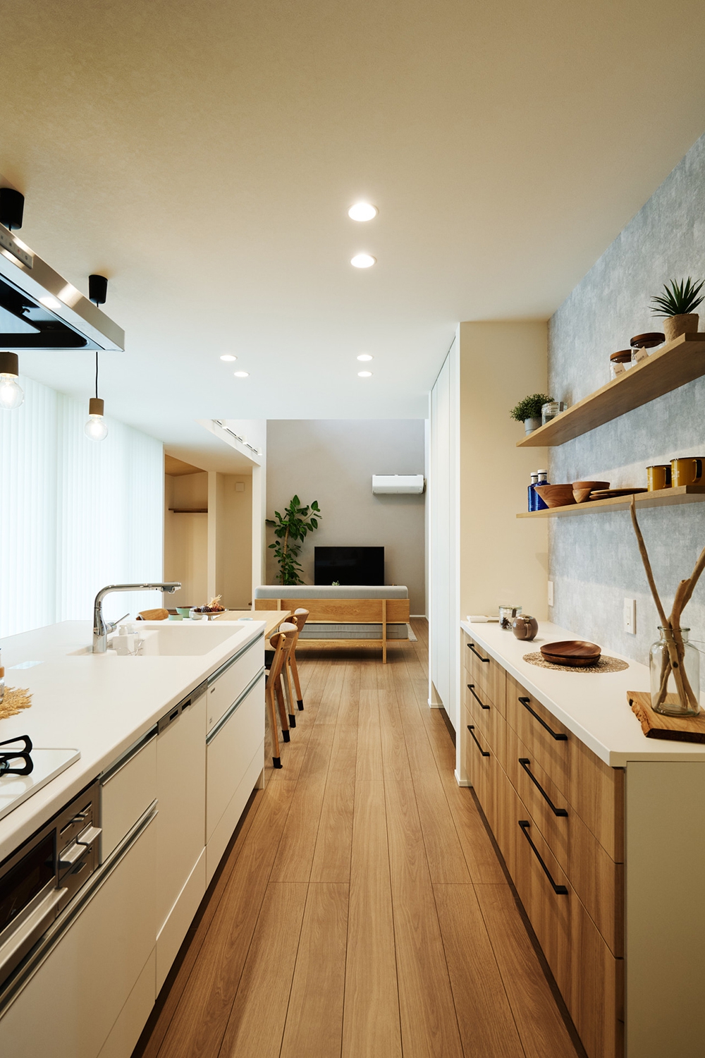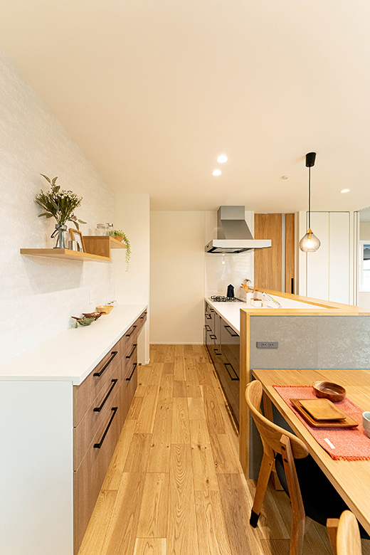 キッチンの床は水に強いフロアタイルを採用。背面の造作カウンターが、収納とディスプレイの両立を叶える