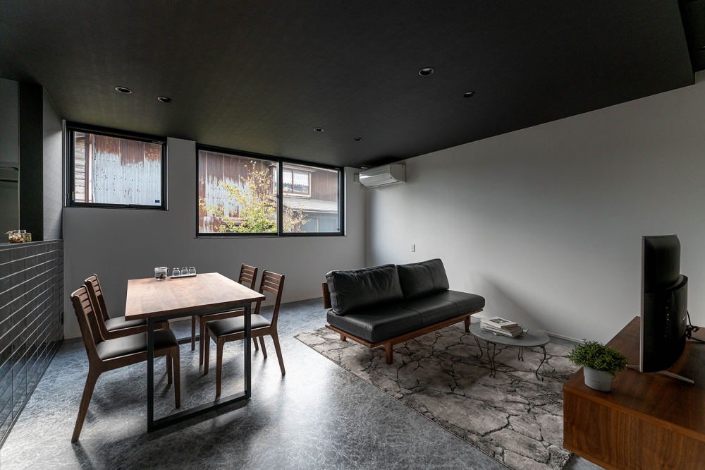 シーリングファンや、照明、扉などにアクセントとなるブラックを使用。空間を引き締めている