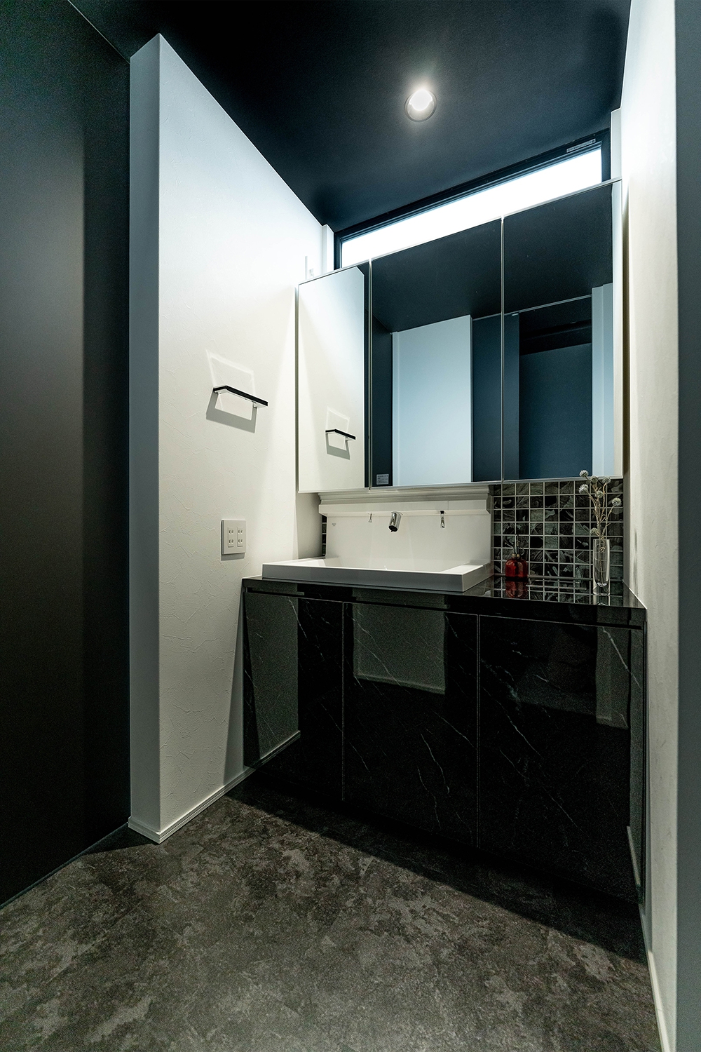 コンパクトにまとめた造作洗面化粧台。ここにもモノクロタイルを採用し、シックな印象に