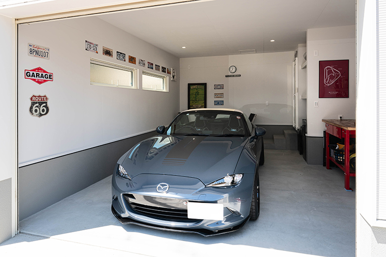 インナーガレージに大事な車を格納し、オープンガレージはすぐに外出できるよう2台分の異なるガレージのある平屋。