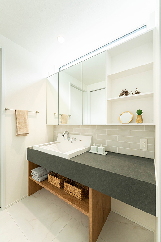 洗面化粧台の天板はメラミンのポストフォームカウンターを採用。機能を確保しつつモルタル天板のような雰囲気を醸し出す