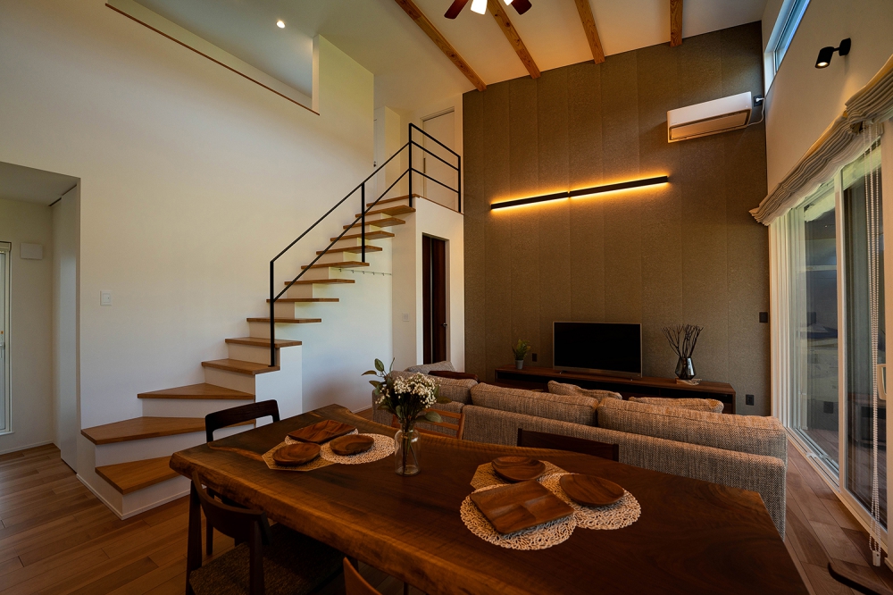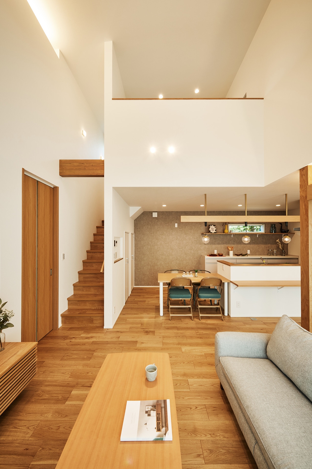 勾配天井と現し梁で、縦の広がりを演出したリビング空間。木の温もりとシンプルな美しさが調和する、心地よい暮らしの中心に