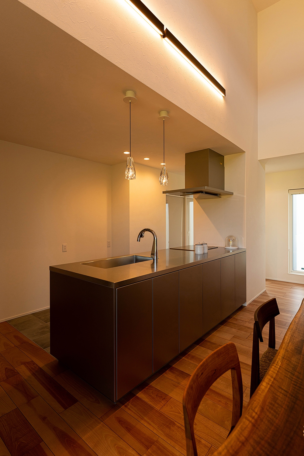 木目の下がり天井と間接照明に癒やされるダイニングキッチン