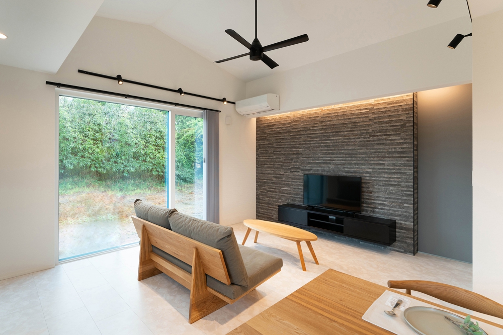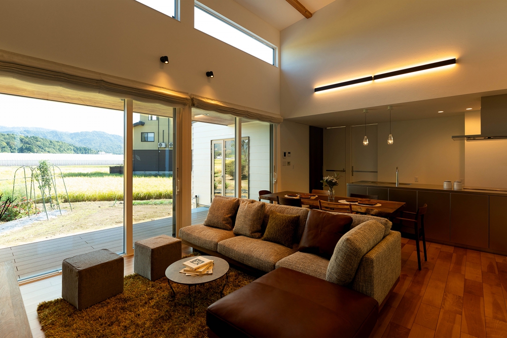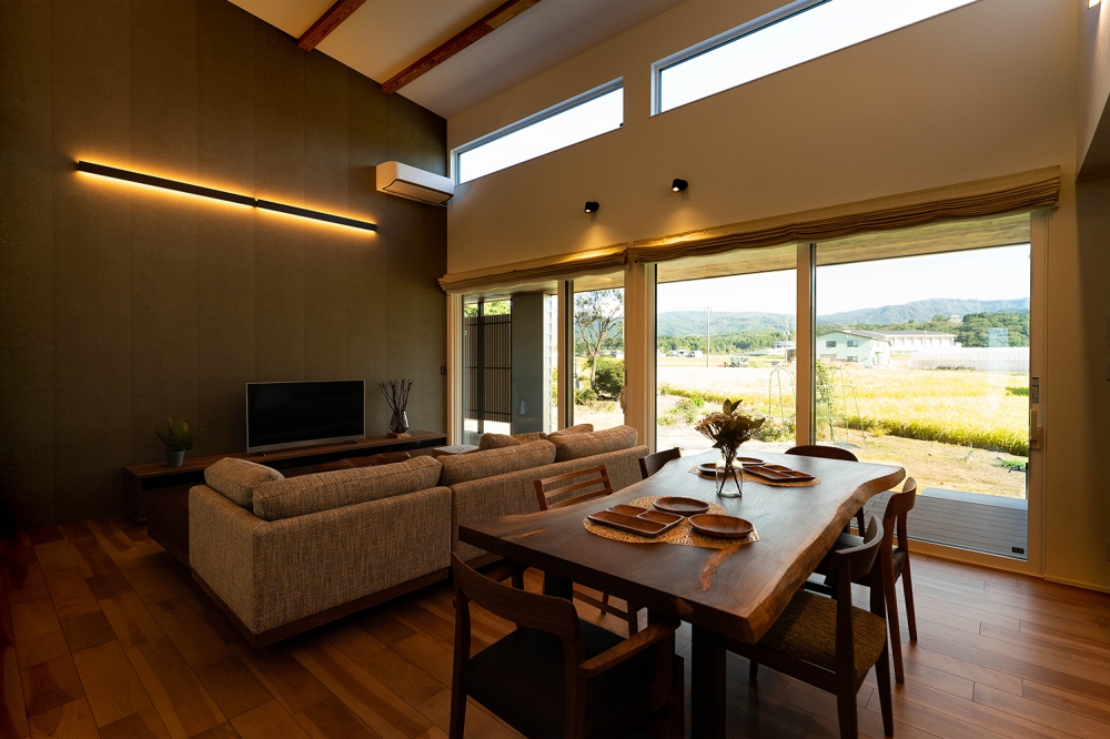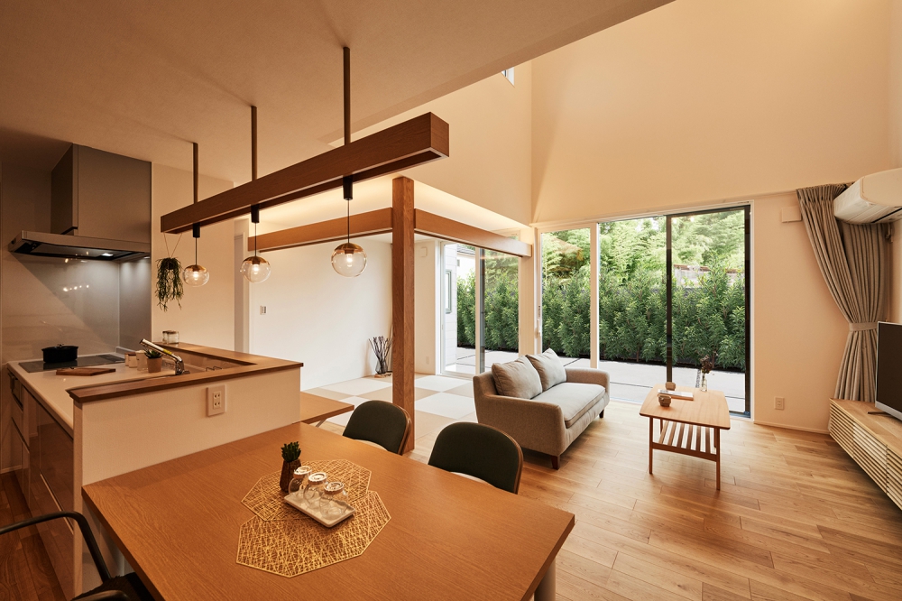 大開口の窓が庭の景色をLDKに届ける。勾配天井に施した間接照明で落ち着きのある空間に