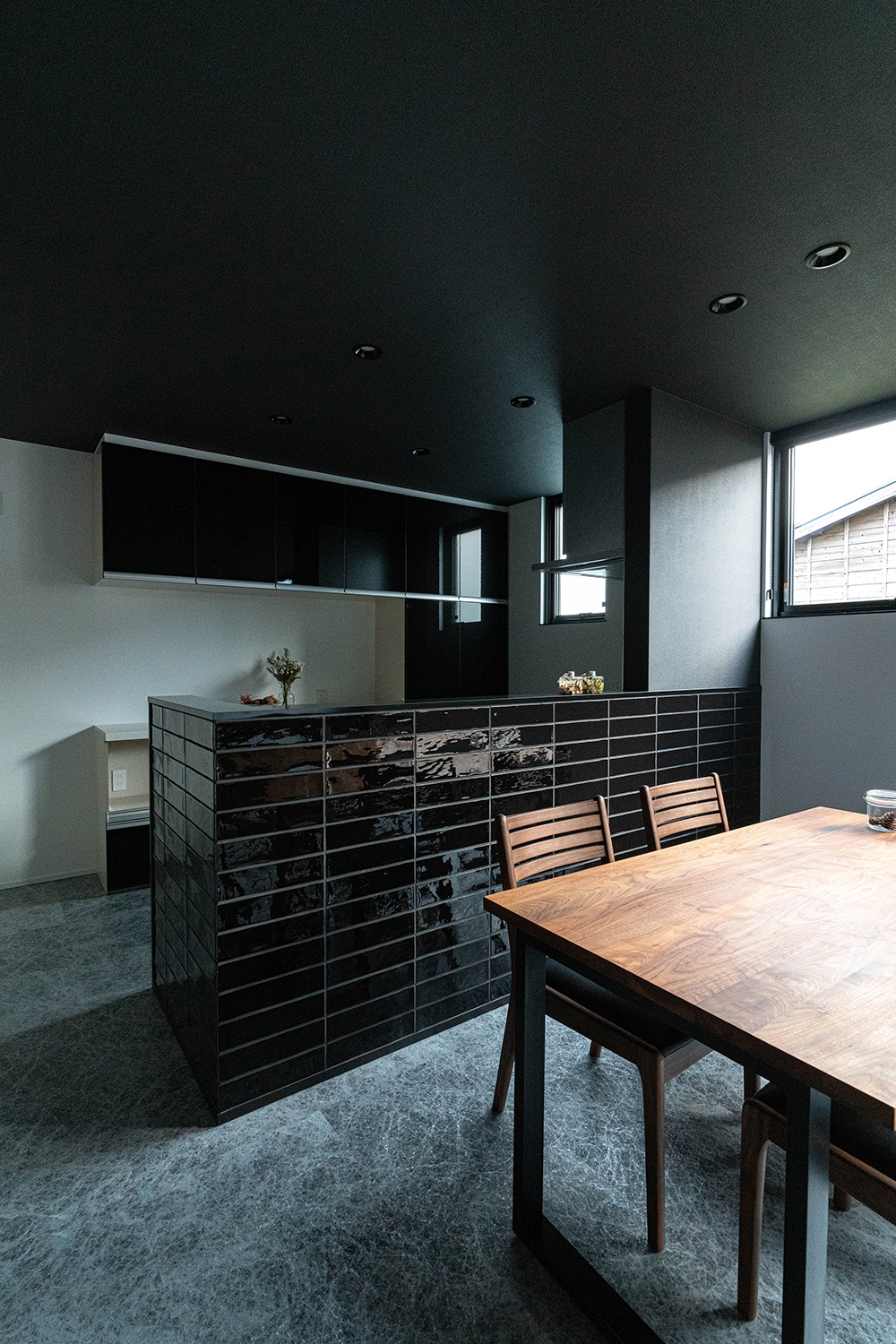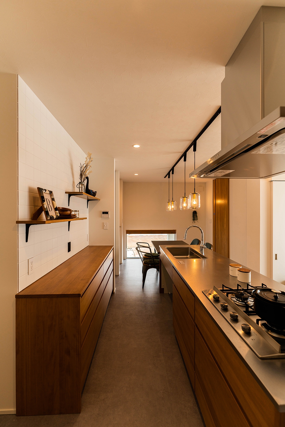 キッチン背面のカップボードは高さを抑えて開放的に。タイル貼りを施して個性をプラス