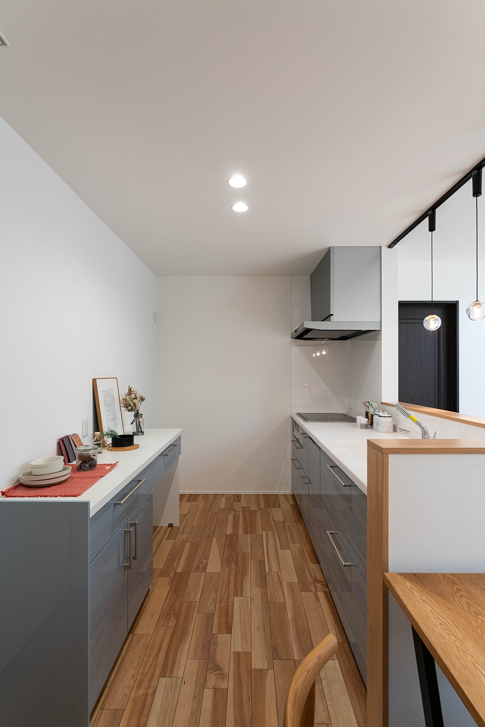 キッチン内部はグレーをベースに、反対側とは雰囲気を変えクールな印象に