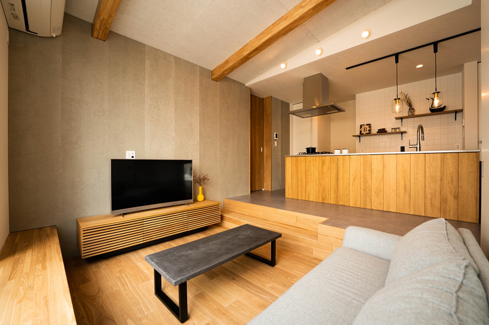 テレビ背面壁にはSOLIDOのシラスを使用。キッチン奥まで使い、空間に統一感を出した