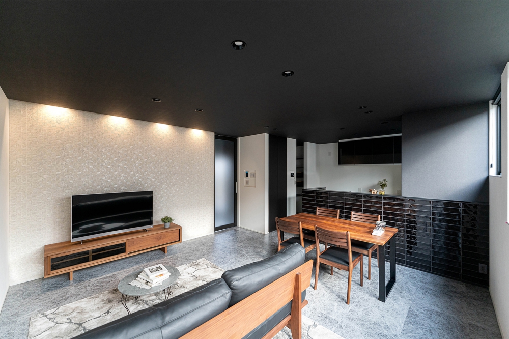 モノクロのLDKは、シックで洗練された雰囲気を演出。TVボード裏にはエコカラット施工し、空間にアクセントを加えた
