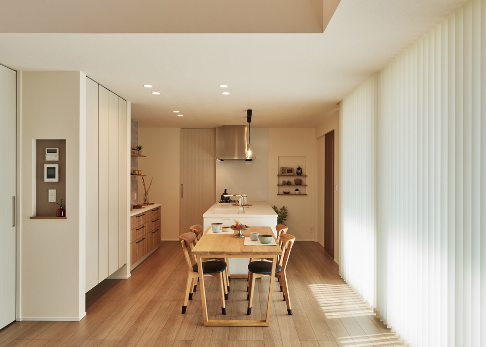LDKは珪藻土の塗り壁を採用し機能性も兼ね備えた落ち着いた"上質な空間"に。