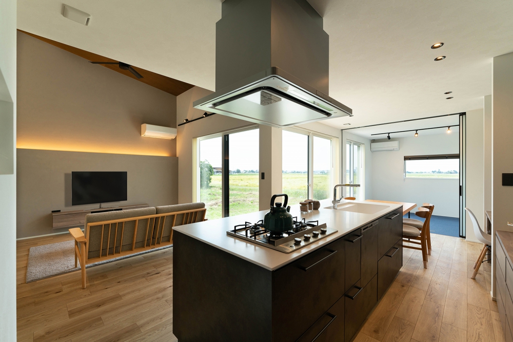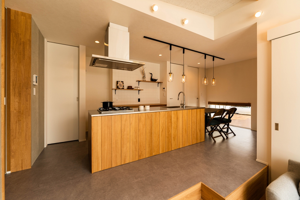 アイランドキッチンにし、ぐるりと回れるようにした。奥にはテラスが続き、室内外が一体となるような設計で、日常の中に豊かな時間をもたらす