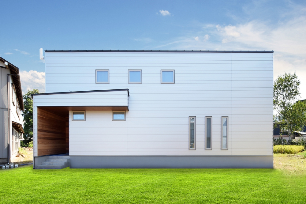 ベースは白いガルバリウム、本物のレッドシダーをアクセントに使用。雪が積もることを踏まえて高基礎に