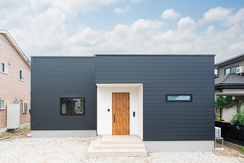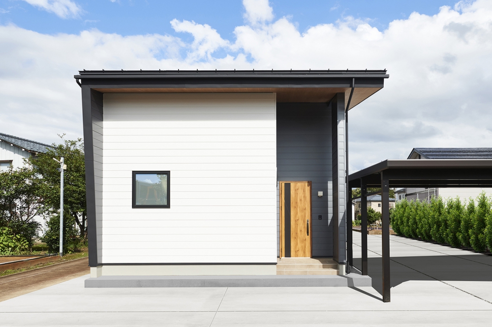 外壁は室内のベースカラーと同じホワイト・グレー・オークの3色でまとめ、内外に統一感をもたらす。柔らかい印象になりすぎないよう、窓枠・屋根・軒天・水切り等にブラックを使用し引き締める