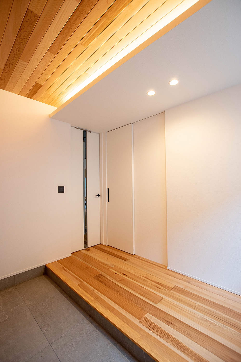 内観は白の壁紙にシナ合板のもつ木目の温もりと、木毛セメント板の醸し出すスタイリッシュさをアクセントに加え、間接照明で演出することでシンプルでありながら個性のあるデザインに。