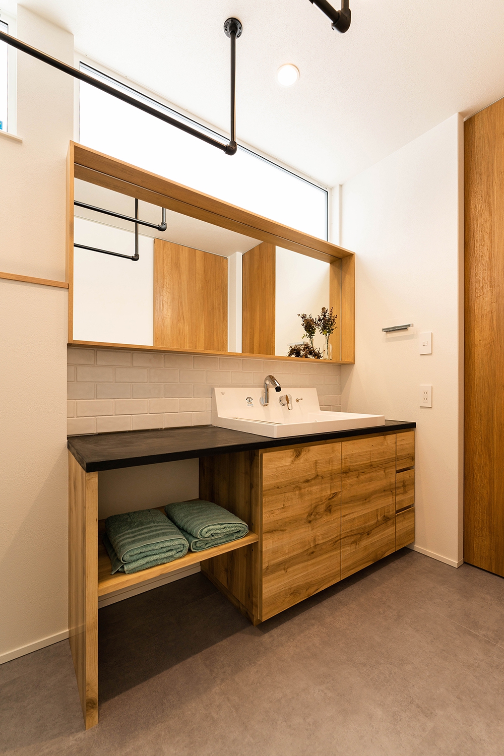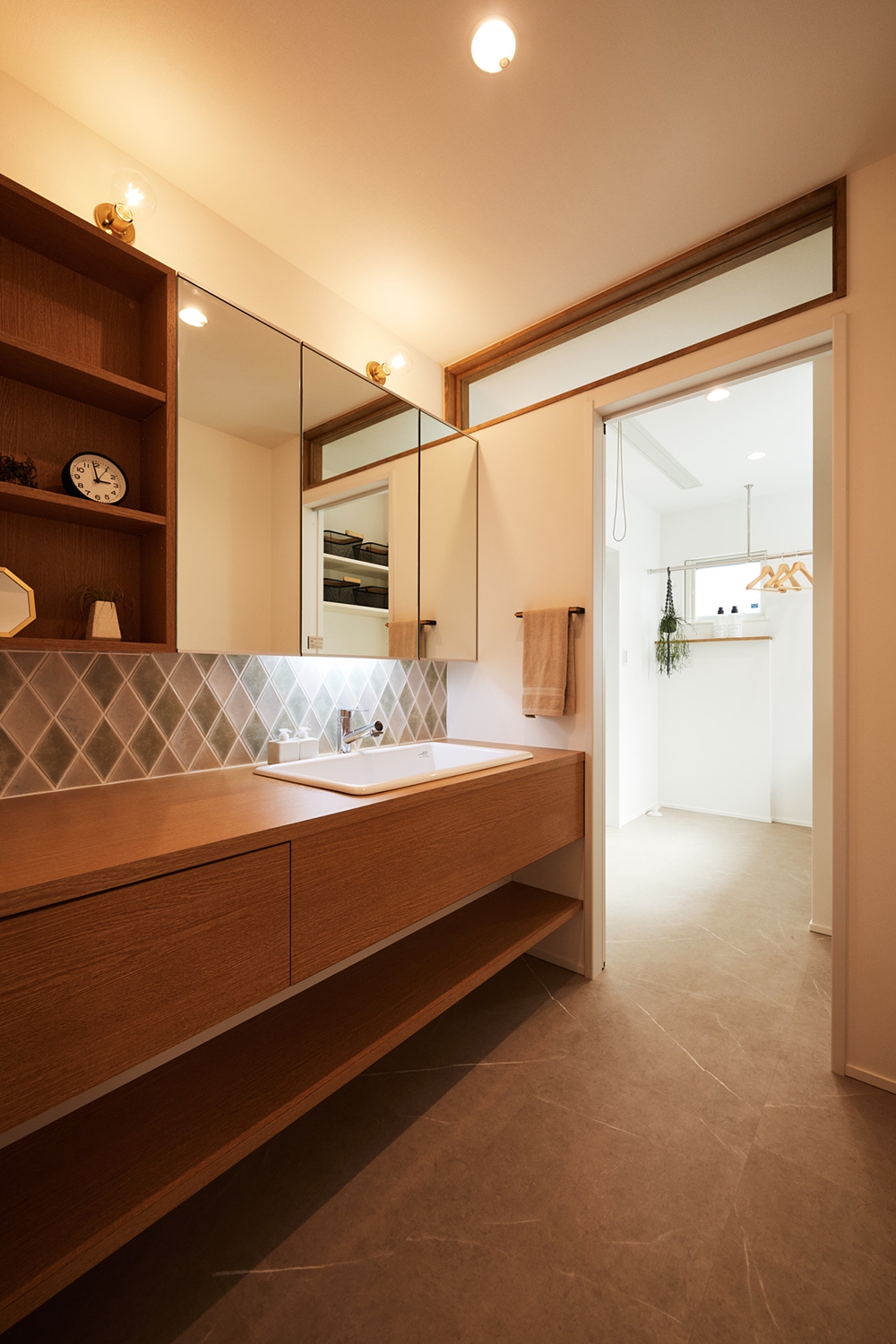 キッチンのカップボードと同じ木目材を使用して統一感を出している造作洗面化粧台