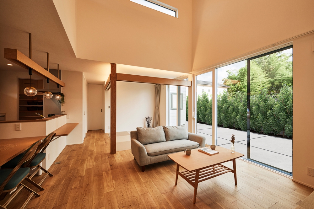 空間全体にやさしい印象を与えるLDK。大きな掃き出し窓から明るい光が差し込み、吹き抜けの高窓とともに心地よい開放感を演出