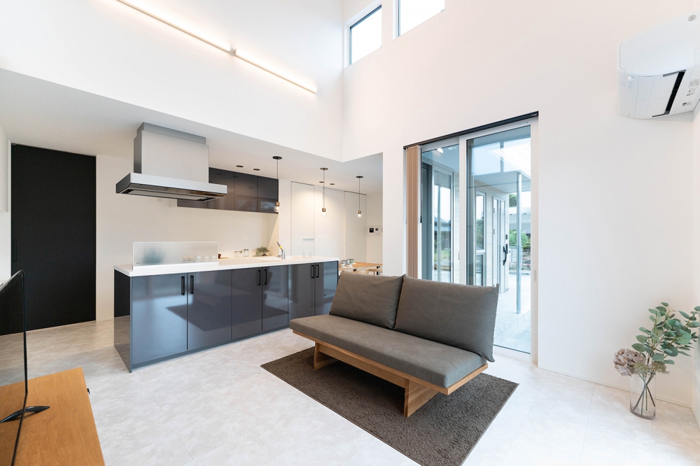 キッチンを中心としたL型のLDKは、2面の大開口サッシから採光をとることで、明るく開放感のある空間に