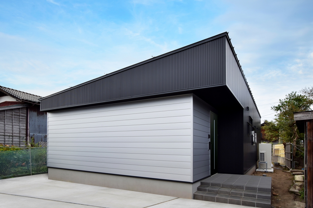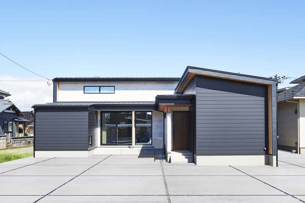 片流れ屋根に素材の異なる2種類の黒いサイディングが美しい外観