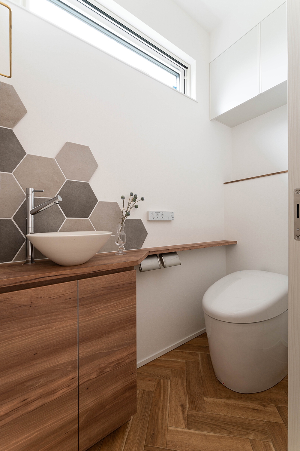 ヘキサゴンタイルのモダンなデザインが融合したトイレ空間。ヘリンボーンの床と木目調キャビネットが温もりを感じさせる