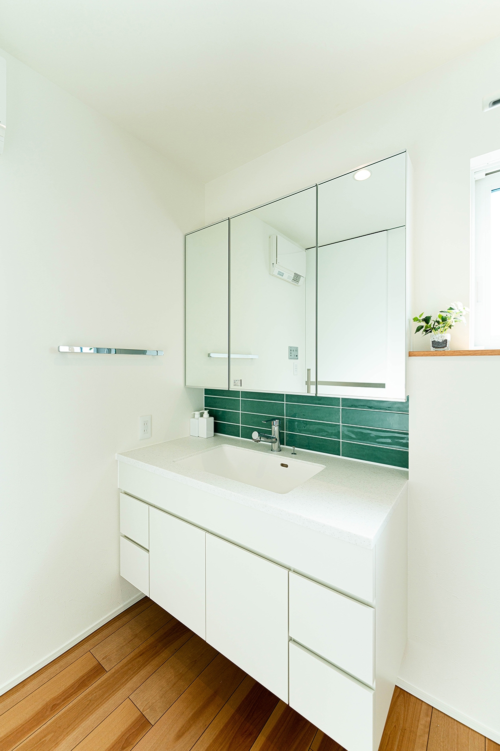 全面鏡が便利な洗面台は、カウンター部分を広く設けて朝の身支度がしやすい設計に。ダウンライトやグリーンのタイルがお洒落に演出する空間はまるでホテルのよう