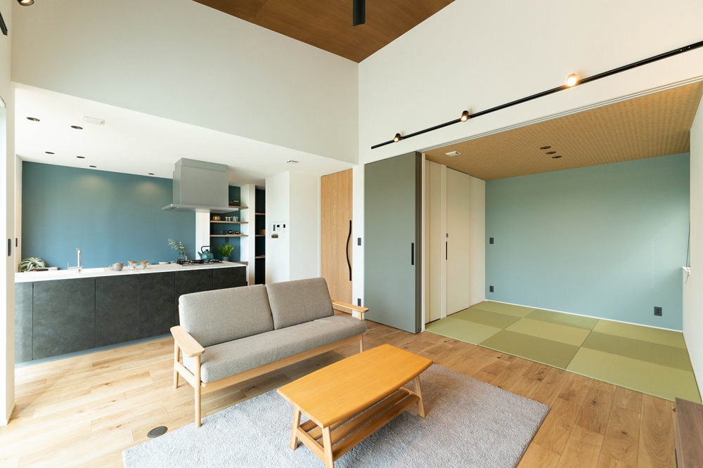 リビングの奥に設けた和室は室内全体の世界観を崩さぬようモダンなテイストを採用。和の良さとモダンなデザインの融合で、そこにいるだけで心落ち着く寛ぎの空間を叶えた