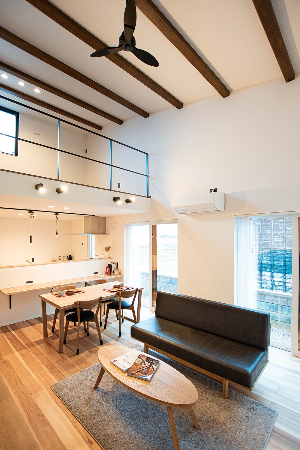ロフトの細い手すり、シーリングファン…と、個性豊かなアイテムで彩りを添えた大空間LDK