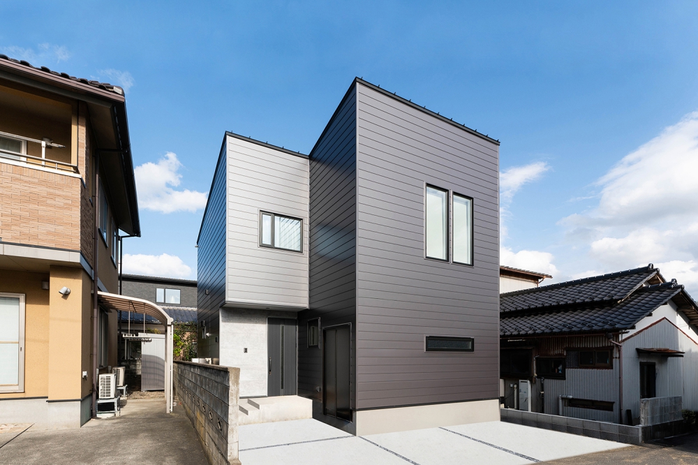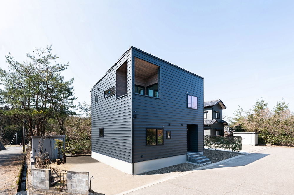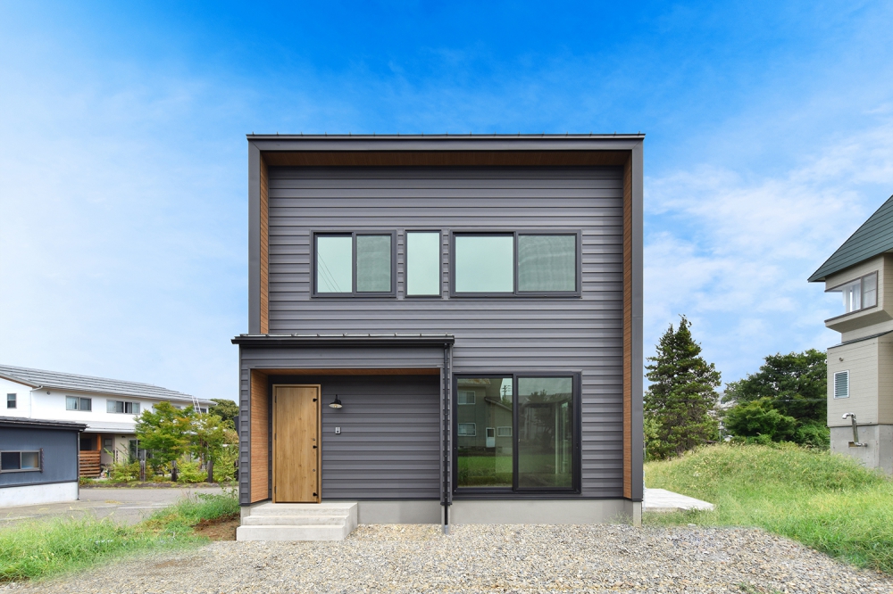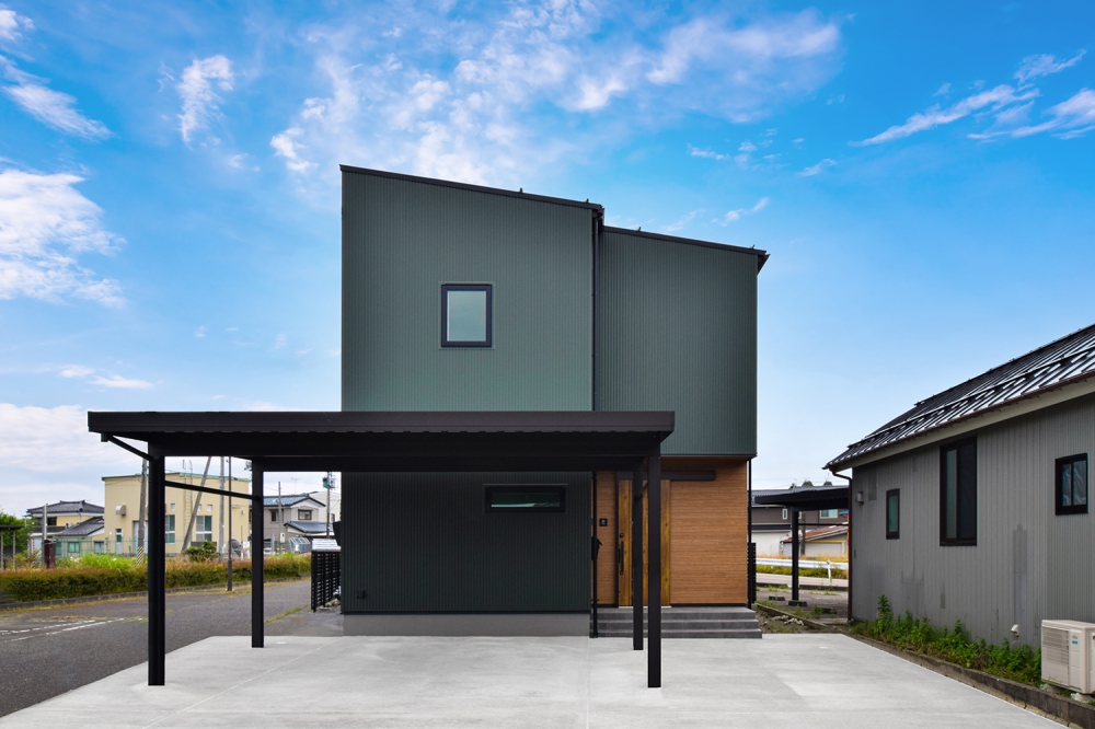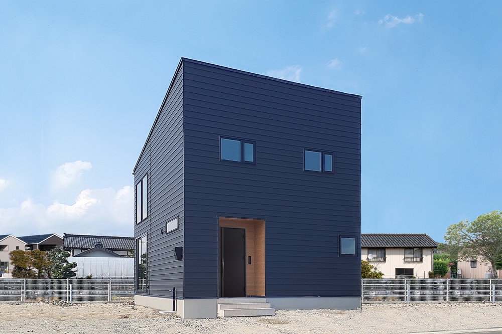 落ち着いたネイビーのガルバリウム鋼板が特徴の外観デザイン。シンプルながらも力強い存在感があり、周囲の街並みにも馴染みつつ個性を発揮